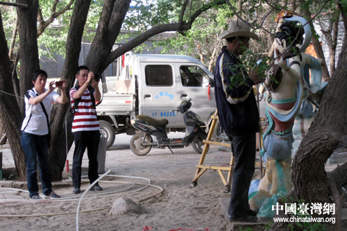 台湾记者方劲松和蓝孝威拍摄工人给飞天雕像涂色的画面。(中国台湾网 郜利敏 摄)