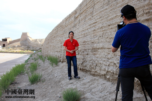台湾记者何劲松和方昶懿在嘉峪关拍摄画面。(中国台湾网 郜利敏 摄)