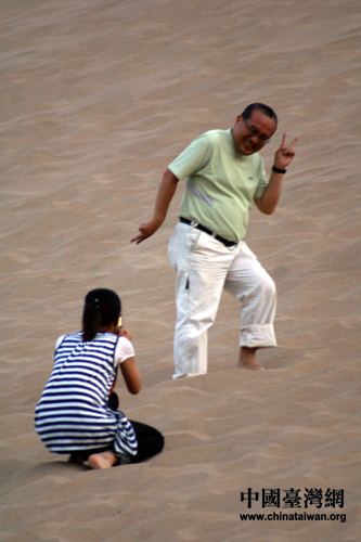 台湾记者康彰荣在鸣沙山拍照留影。(中国台湾网 郜利敏 摄)