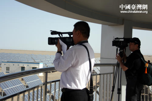台湾记者刘文树和方昶懿在敦煌市太阳能产业园区拍摄。(中国台湾网 郜利敏 摄)