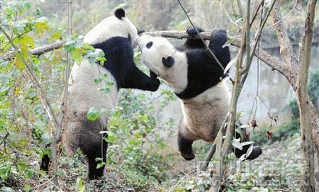 昨日下午阳光很好,一向爱睡觉的"帅哥"团团带着"美女"圆圆在别墅的草地上玩耍。调皮的圆圆一把抓住树枝,荡起了秋千,团团则温柔地站在身后保护着它,这一幕引得游客们不断惊呼,"太浪漫了!"