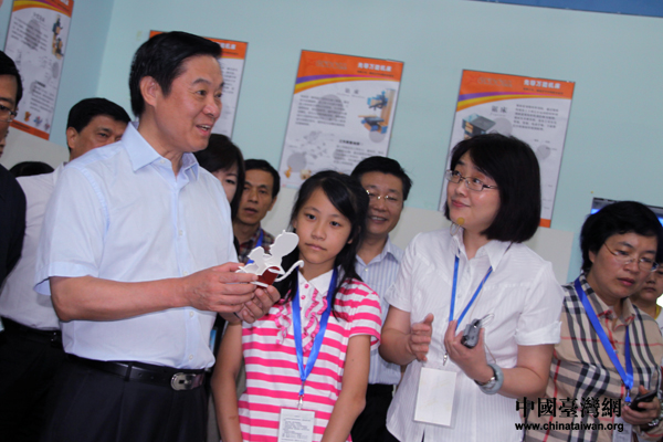 应中共四川省委书记刘奇葆邀请,台湾云林县、南投县和彰化县的105名师生,由台湾民意代表马文君、王惠美带队,赴四川参加第三届“台湾学生天府夏令营”活动。图为刘奇葆饶有兴致地欣赏台湾小朋友制作的模型。(中国台湾网 王伟 摄)