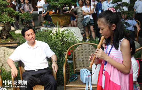 刘奇葆书记认真聆听黄绎心小朋友的笛子演奏。(中国台湾网 赵辉 摄)