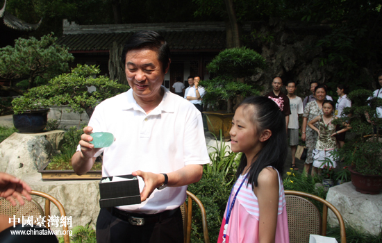 黄绎心小朋友将象征事事如意的琉璃柿子送给刘奇葆书记。(中国台湾网 赵辉 摄)