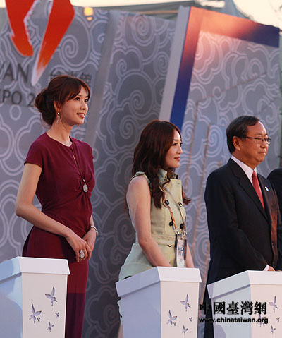 林志玲同另外两位台湾馆形象代言人一起面对媒体。(中国台湾网 钟宝华 摄)