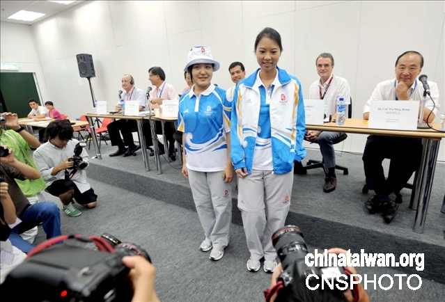 七月十八日,奥运马术公司在沙田赛场召开关于奥运马术的首个新闻发布会,两位女士身穿奥运賽场工作制服向传媒展示。中新社传真邓庆乐摄