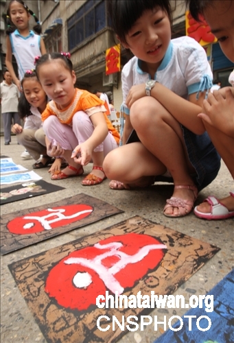 2008年8月19日,湖北襄樊市金童美育绘画学校的版画制作课上,孩子们在欣赏自己制作的奥运版画。该校利用美术专长,让孩子们了解奥运,参与奥运,为奥运加油。 文铭 摄