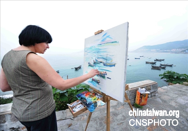 随着北京奥运会开幕的临近,风景秀丽的北京奥运会帆船赛举办地青岛也越来越为海内外所关注,并吸引了众多的海内外游人前往观光旅游。图为俄罗斯海参崴艺术学院的柳德米拉(译音)教授在青岛海滨写生。 作者:曲连遵