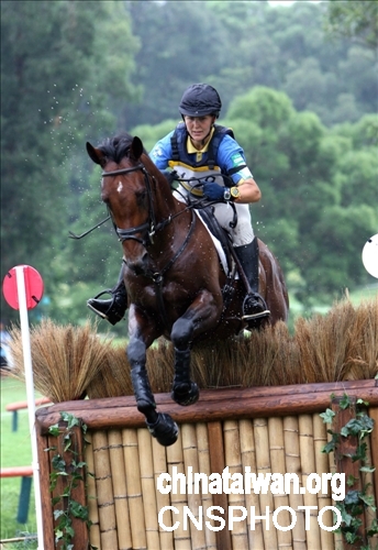 “好运北京-香港回归十周年杯国际马术三项赛”越野赛,8月12日在香港奥运马术比赛场地(双鱼河)进行。来自德国的骑手奥斯佛法兰克(Ostholt Frank),以七分五十一秒取得最好成绩,总成绩由昨日第四位升至首位。 图为瑞典女骑手与她的座骑腾空越过障碍物。 作者:王丽南