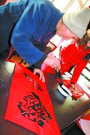 延庆县康庄镇大丰营村老书法爱好者为邻里写春联。郭明旺摄