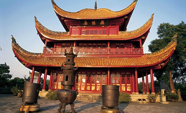 素有"洞庭天下水,岳阳天下楼"盛誉的岳阳楼踞于岳阳古城的西门之上,其气势之壮阔,构制之雄伟,堪称江南三大名楼之首. 名冠天下的岳阳楼构制独特,风格奇异.楼三层、飞檐、盔顶、纯木结构. 全楼高达25.35米,平面呈长方形,宽17.2米,进深15.6米,占地251平方米.楼中四柱高耸,楼顶檐牙啄,金碧辉煌.远远而瞭,恰似一只凌空欲飞的鲲鹏,尤显雄伟壮丽。