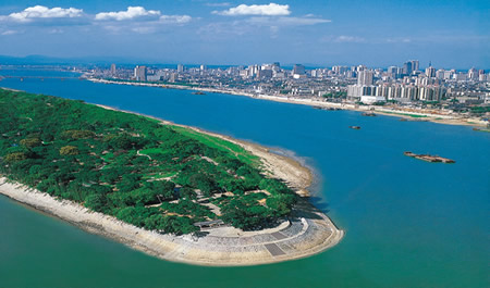 四面环水,洲上林木众多,远看如一艘墨绿色的巨舰,逆水扬波护卫着长沙古城。它西望岳麓,东临城邑,南北长5km,东西宽50~200m,总面积近70hm2,是国内最著名的江心洲,也是世界上最长的内河绿洲。洲上盛产美橘,故名橘洲,自古以秀丽风光、悠久历史著称,是宋代著名的“潇湘八景”之“江天暮雪”所在。橘洲“五六月间无暑气”,是一处消夏胜地,毛泽东青年时代常来此地游泳漫步,在沙滩上进行日光浴。现橘子洲已辟为公园,植有柑橘千株,每当秋收季节,橘果累累;建有亭廊,公园中耸立着一块巨型汉白玉纪念碑,碑上篆刻着毛泽东手书的“橘子洲头”四个大字和他1925年秋写的《沁园春·长沙》一词;橘洲中部的两侧建有天然游泳场;洲上有公路纵贯南北。市政府拟将此地建成一个集园林、旅游、娱乐、体育、文化、商贸于一体的多功能国际性观光文化名胜区。规划中的景区分为“二廊七园”:十里湖湘文化廊、十里水上游乐廊、万橘竞秀园、回归自然园、来者谐乐园、购物美食园、健身益寿园、风情度假园、野外生活园,拟投资20亿元。