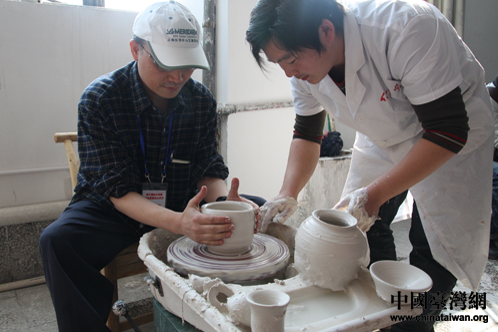 虽然无法亲身参与釉下五彩瓷烧制的全过程,但是台湾媒体朋友们还是享受了格外的待遇,尝试了泥坯形状的制作。来自台湾中时集团的记者小齐成为了第一个吃螃蟹的人,转盘上细细的泥坯随着他手指间的力度改变着姿态。在享受与泥坯融为一体的乐趣同时,他也坦言,这项工作看着容易,实际操作却很不好把握。对于大师们设计的那些造型别致、工艺繁琐的瓷器,他表示由衷的佩服。(记者 陈宁)