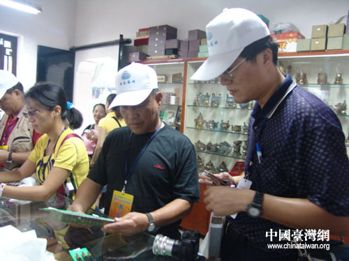 参观即将结束时,记者发现书院纪念品销售柜台前围满了挑选纪念品的台湾教师们,于是询问其中一位正在挑选的教师准备买些什么,他举起已经爱不释手的一套毛笔说:“到书香圣地,当然是要买文房四宝了!”。(文萃)