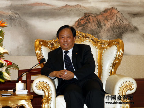 全国台联会长梁国扬在河南参加黄帝故里拜祖大典期间同两岸媒体交流。(钟宝华 摄)