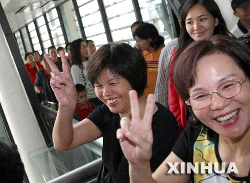9月29日13时25分许,自台北起飞的台湾长荣航空公司BR1712航班,载着309位乘客抵达上海浦东国际机场。这是2006年两岸中秋包机飞抵大陆的首个航班,标志着两岸客运包机节日化的正式启动。(新华社记者 张明 摄)