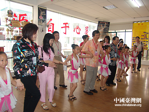 “孩子们真是多才多艺!”一下车,参访团的成员便被在广场上跳拉丁舞的孩子们所吸引。来到拉丁舞教室,在极具节奏感的音乐“诱惑”下,与正在上课的孩子们一起跳了起来。副团长叶新拉着孩子的门的手一边跳舞,还不时的低头询问孩子们的学习情况。
