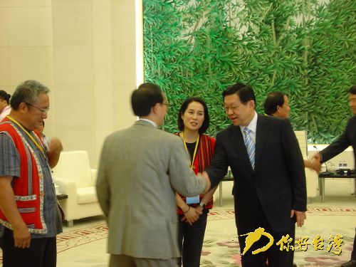 陈德铭(右一)与台湾少数民族代表团成员握手