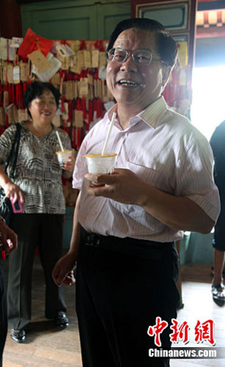 9月8日,中华文化联谊会名誉会长蔡武在台南市参观赤崁楼。图为蔡武喝着当地民众最常引用的冬瓜茶,观赏历史古迹。中新社记者 刘舒凌 摄