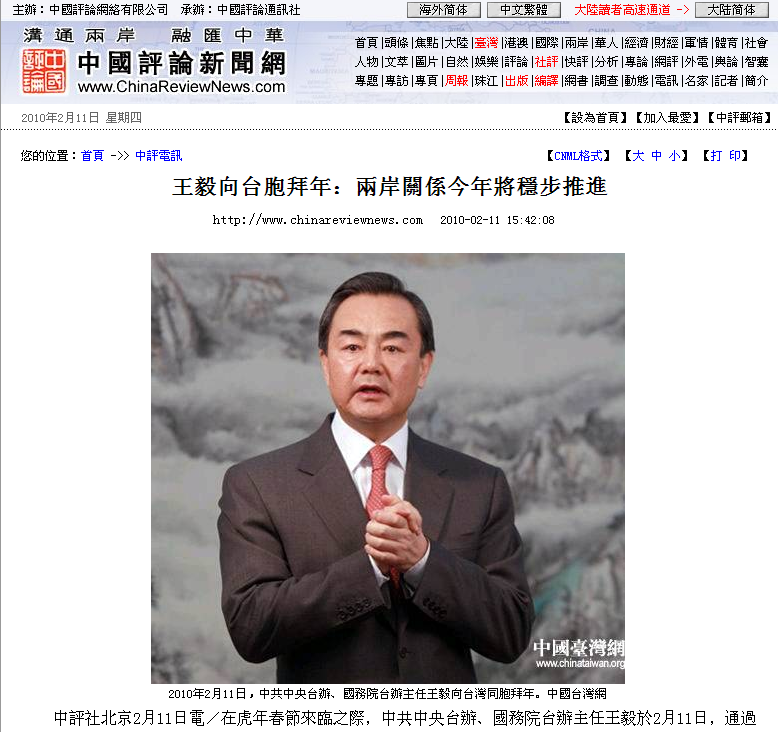 2010年2月11日,中共中央台办、国务院台办主任王毅向台湾同胞拜年。中国台湾网