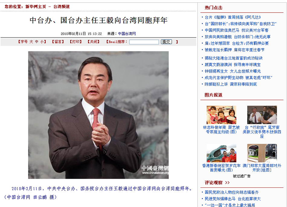 2010年2月11日,中共中央台办、国务院台办主任王毅通过中国台湾网向台湾同胞拜年。(中国台湾网 田云鹏 摄)