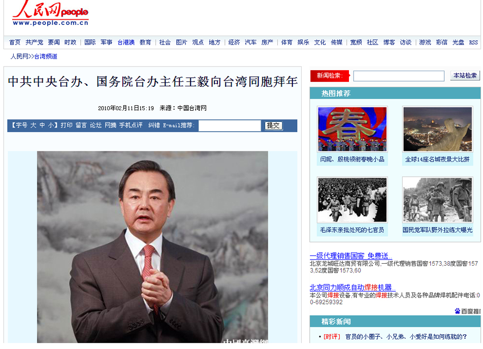 在虎年春节来临之际,中共中央台办、国务院台办主任王毅于2月11日,通过中国台湾网,向台湾同胞拜年,祝福台湾同胞新春愉快,万事如意。以下为王毅主任拜年贺辞全文:
