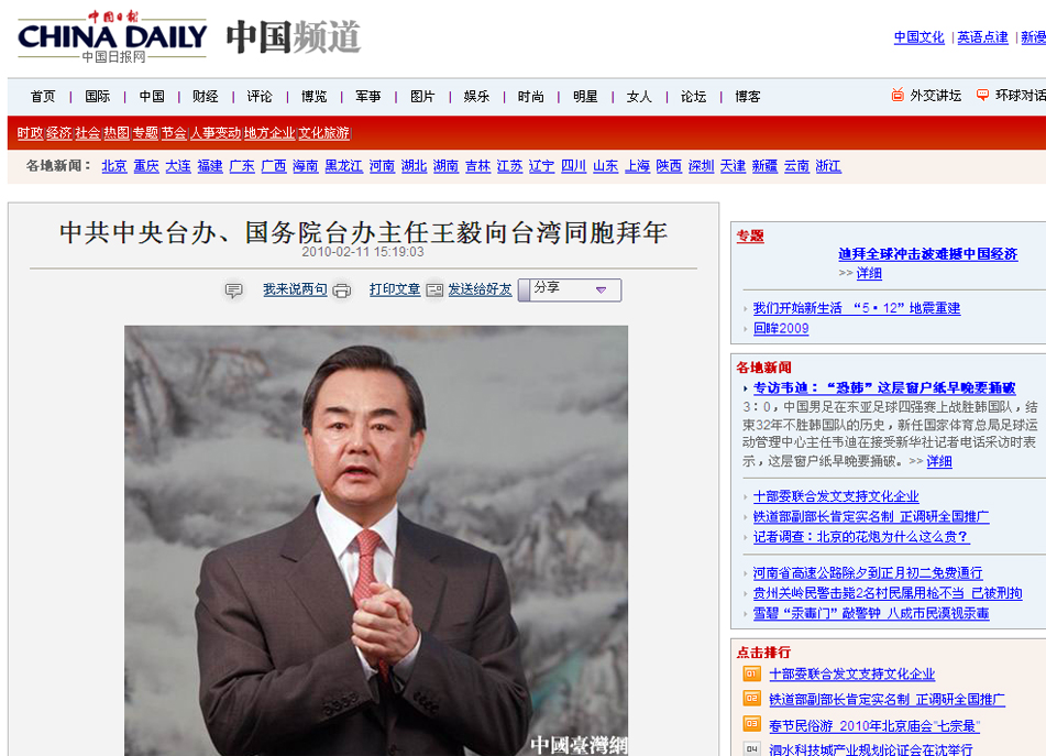 2010年2月11日,中共中央台办、国务院台办主任王毅通过中国台湾网向台湾同胞拜年。(中国台湾网 田云鹏 摄)