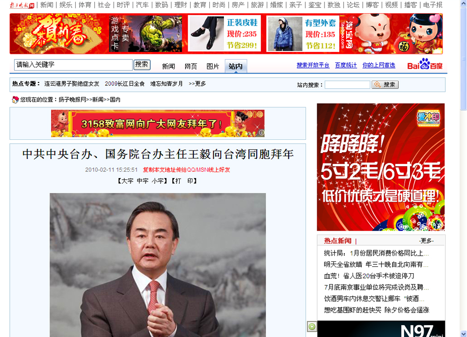 [扬子晚报网] 中共中央台办、国务院台办主任王毅向台湾同胞拜年