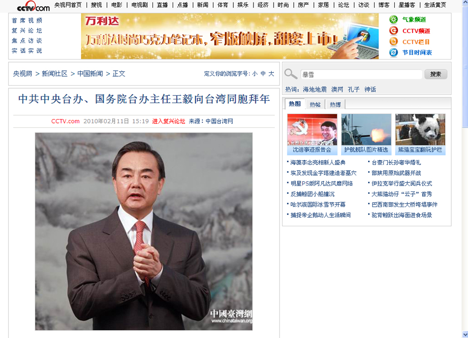 [央视网] 中共中央台办、国务院台办主任王毅向台湾同胞拜年