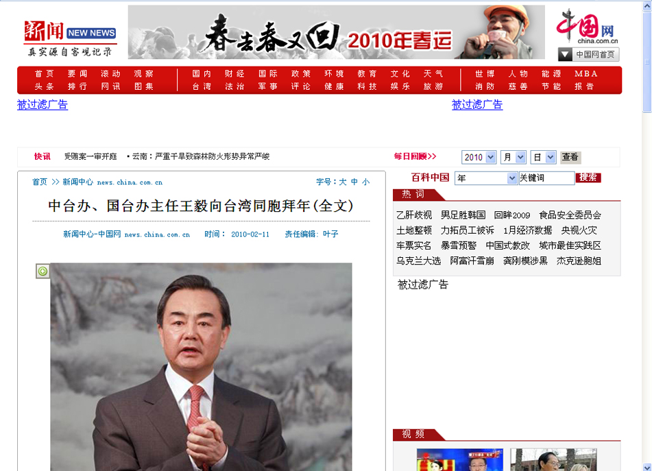 2010年2月11日,中共中央台办、国务院台办主任王毅通过中国台湾网向台湾同胞拜年。(中国台湾网 田云鹏 摄)