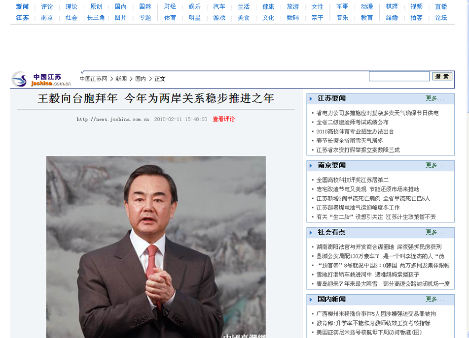 2010年2月11日,中共中央台办、国务院台办主任王毅通过中国台湾网向台湾同胞拜年。