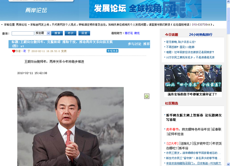 2010年2月11日,中共中央台办、国务院台办主任王毅向台湾同胞拜年。(中国台湾网)