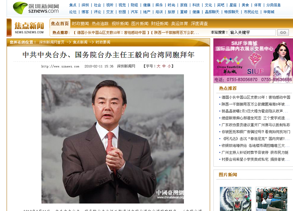 2010年2月11日,中共中央台办、国务院台办主任王毅通过中国台湾网向台湾同胞拜年。(中国台湾网 田云鹏 摄)