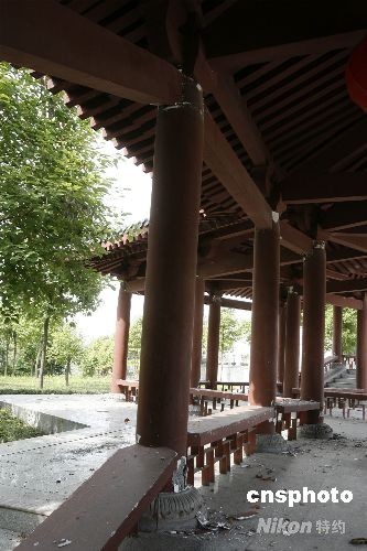 六月五日,四川江油李白故里被损坏的梁柱。受汶川地震影响,江油李白故居房屋全部拉裂,部分垮塌,清代建筑几乎全部倒塌。有关文物部门初步估算,修复李白故里的费用可能达到三千万至五千万元人民币。 中新社发 慎重 摄