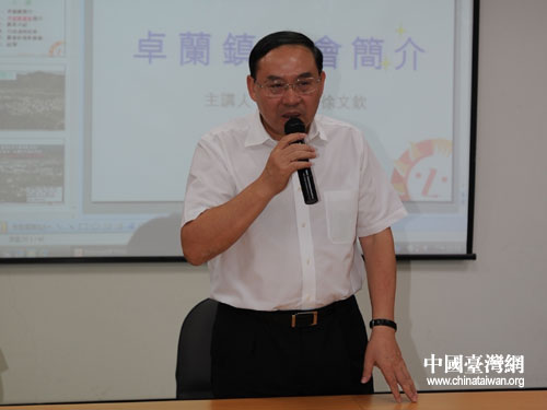 梅克保在听取农会组织负责人介绍卓兰镇水果生产销售情况后讲话。(湖南省台办 李兰 摄)