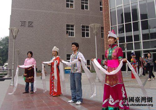 在“投入民族大家庭,感受民族温暖情”为主题的欢迎仪式上,民族大学的学生为台湾客人献上了象征友情与祝福的哈达,并且纷纷用各自民族的语言向客人们致意。
