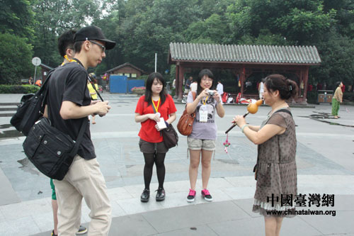 来自台北海洋技术学院的曹瑞、李光麒、李欣芳、许宴萍对葫芦丝很感兴趣(中国台湾网 李丹 摄)