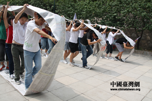 中国台湾网8月18日太原消息 18日上午,台湾青年交流团一行来到了位于山西太原的中北大学,和这所高校的青年学生开展交流活动。没有座谈会式的相互介绍,没有导游式的校园介绍,一项考验团队协作、沟通、互动的拓展训练使两岸青年在比赛中相识,在协作中相知,在胜利时相拥。
