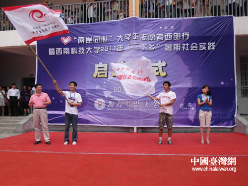 中国台湾网7月12日绵阳消息 日前,由绵阳市台办、共青团西南科技大学团委、清华大学港澳台事务办公室、西南科技大学港澳台事务办公室、游仙区刘家镇党委政府共同主办的第五届“两岸同心”大学生志愿者西部行暨西南科技大学2011年“三下乡”暑期社会实践活动在四川绵阳刘家镇小学正式拉开帷幕。来自台湾新竹清华大学、台湾师范大学、台湾大学、成功大学以及清华大学(北京)、中国美院和绵阳西南科技大学等40余名师生参加启动仪式。