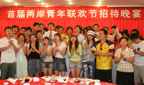 中国台湾网06年8月9日厦门消息 “遥远的东方有一条龙,它的名字就叫中国……”,“难忘今宵、难忘今宵……共祝愿祖国好、祖国好……”,“朋友一生一起走……一句话,一辈子,一生情,一杯酒”,“当你踏上月台、从此一个人走……深深的祝福你,我亲爱的朋友,祝你一路顺风”……这些耳熟能详的歌曲,在昨晚的首届两岸青年联欢节招待晚宴上被一一唱响。