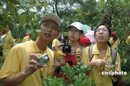 参加"两岸青年联欢"海南行的三百多名台湾青年,八月十八日参观琼海台资休闲农场伊甸园山庄。图为学子们在山庄采摘柠檬果。 中新社发 王辛莉 摄