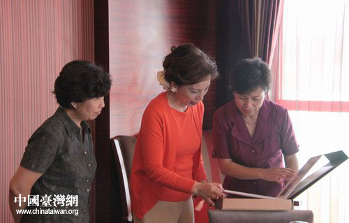 河南省台办主任宋丽萍向蒋孝严夫人黄美伦女士赠送纪念品。(图片来源:河南台办)
