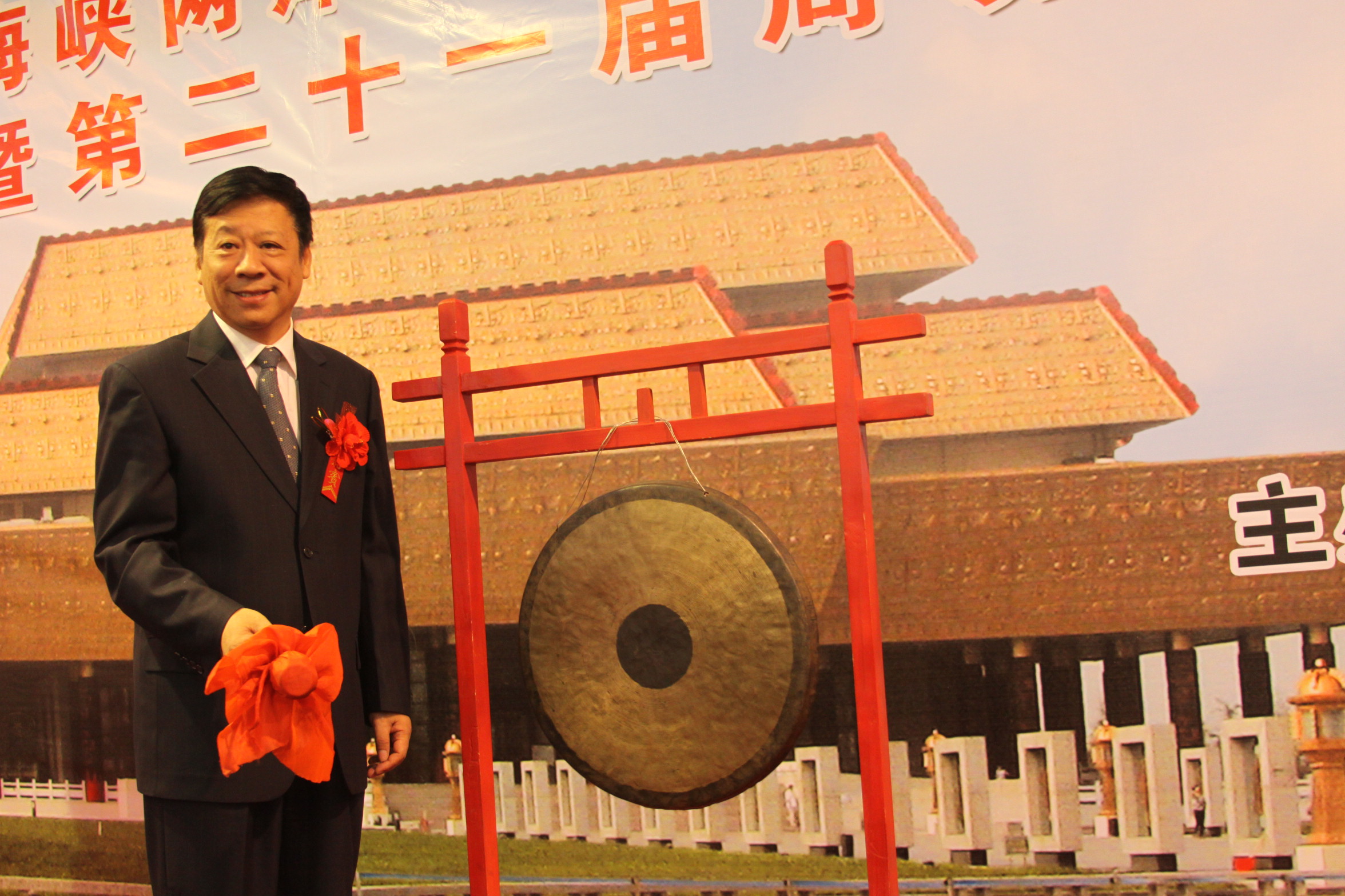 靳绥东副主席为海峡两岸周易与现代化学术论坛暨第二十一届周易国际讨论会鸣吉祥锣。图片来源:河南省台办