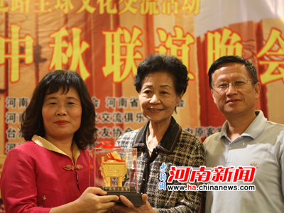 河南省客家联谊会会长林雪梅(中)向台湾客家亲人(左一)赠送“中原圣土宝鼎”