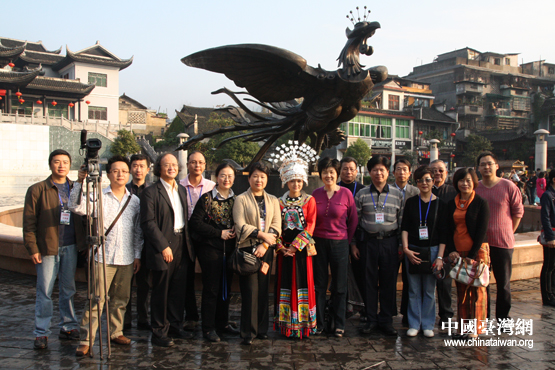 两岸媒体在凤凰古城前合影(中国台湾网 陈宁 摄)