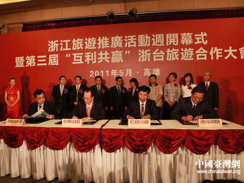中国台湾网5月28日高雄消息 27日下午,浙江旅游推广活动周开幕式暨第三届“互利共赢”浙台旅游合作大会在高雄举行。中共浙江省委书记赵洪祝在会上表示,今年将努力组织10万名浙江游客赴台湾高雄等中南部地区旅游。