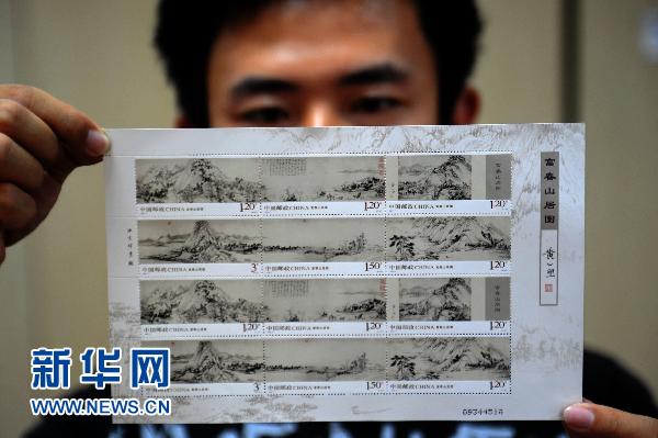 这是2010年《富春山居图》成画660周年之际首发的《富春山居图》特种邮票。该邮票以《富春山居图》整幅画卷为蓝本(5月11日摄)。当日,元代黄公望《富春山居图》(剩山图)在浙江省博物馆点交启运,将经由北京后赴台,于6月1日在“山水合壁——黄公望与《富春山居图》特展”上,与台北故宫博物院所藏《富春山居图》(无用师卷)联合展出。这将是该画作两部分在分别360年后首次实现合璧。新华社记者 韩传号 摄