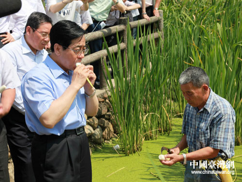 中国台湾网5月31日南投消息 30日上午,中共浙江省委书记赵洪祝、省委秘书长李强等来到南投县埔里镇向善里蔬菜产销班第七班,与南投埔里镇蔬菜产销班农民做交流。