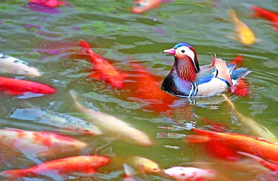 杭州一名人故居的池塘中鸳鸯与鱼儿共游。一群鱼儿围着鸳鸯,一脸艳羡,好一幅真实版的“只羡鸳鸯不羡仙”。(