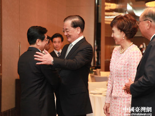 连战及其夫人欢迎赵洪祝书记一行的到来。(浙江台办王健摄)